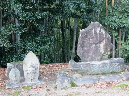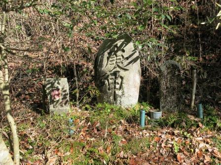 右手に地蔵堂があり、堂内に蘭川の川原から引き揚げられた自然石が安置されている。![]() 堂の前には「寒山拾得」と書かれた覆いの下に、上部に彫刻の施された自然石が置かれている。 説明文によると、「地震で崩れた石段から発見されたもので、道祖神として祀られてきた。寒山拾得を題材にしたもので、文政年間(1818~30)に光徳寺の「中外和尚」が彫ったと推察されるという。寒山は、拾得とともに唐代の奇行の僧で、「巻物」と「箒」をもっている。」 |