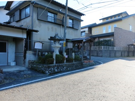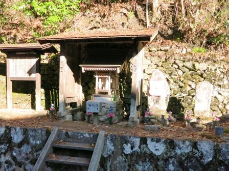 左手に妻籠発電所の建物を過ぎると、右の石垣の上に2つの石仏と小さな祠がある。 説明板によると、「木曽路(中山道)から伊奈(飯田)道が分岐していた処で、右の竹藪の中に痕跡があるという。宝暦年間( 1760ころ)飯田道が付け替えられ、ここから600m程南の橋場に追分が移動した。」という。祠は、「おしゃごじさま といい、御左口(ミサグチ)神を祀る。土俗信仰の神様で、諸説ある謎の神様」という。 |