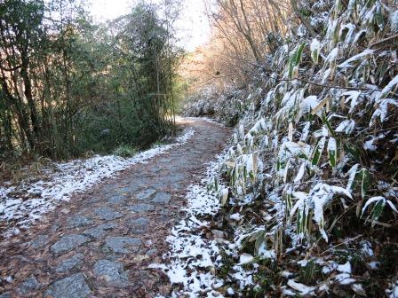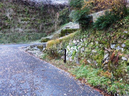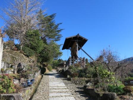 ここから馬籠峠に向かう上り道である。陣馬跡から北に向かうが、民家が建っているところを迂回して、急な石段を下って県道に合流した後、分岐して山道を登る。入ったところにクマ除けの鐘がある。 馬籠峠まで、県道と所どころで交差しながら上って行く。一昨日に降ったと思われる雪が道端に残っている。 ![]() 県道の向こう側に水車小屋があり、水車塚がある。土石流により犠牲になった一家4人を供養する。 ![]() 急な梨子ノ坂にはいる。最初は石畳が続き、そのあとは舗装されており、馬籠峠が先に見える。 |