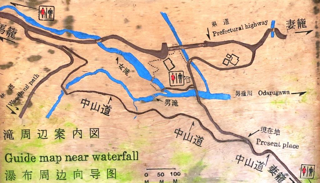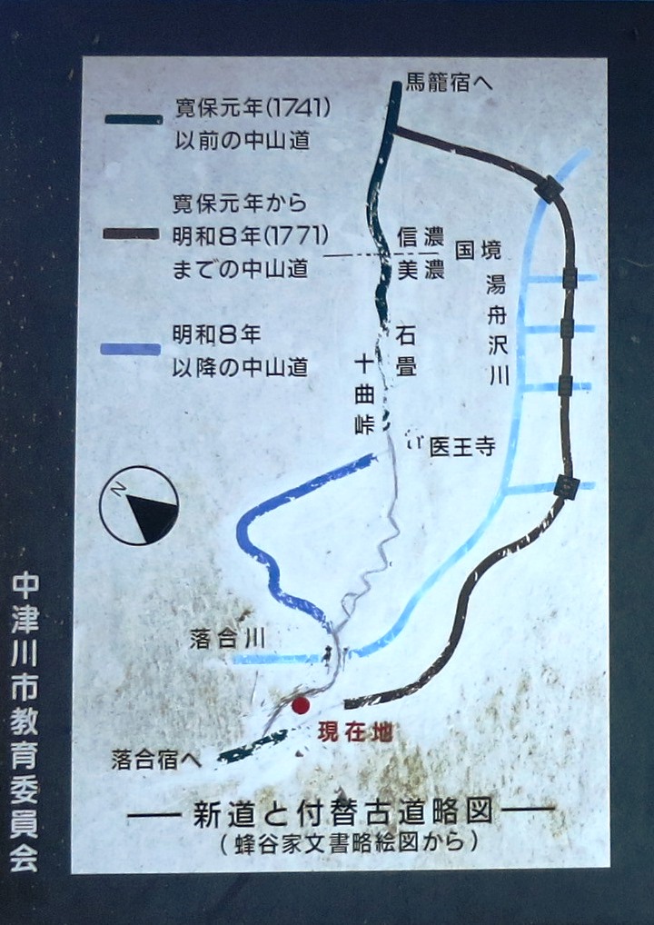県道に出てしばらくすると、右に入る道がある。江戸末期以降の中山道は、このルートである。 この先に男滝・女滝という二つの滝があり、周辺が険阻であった為、中山道はしばしば付け替えられたという。更に先に下って行き、新旧二つが交差しているところに建っている説明板の地図がわかりやすい。(クリックして拡大) 今回は、幕末まで使われていたという滝の下の道を行く。 |
