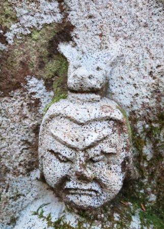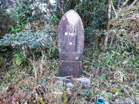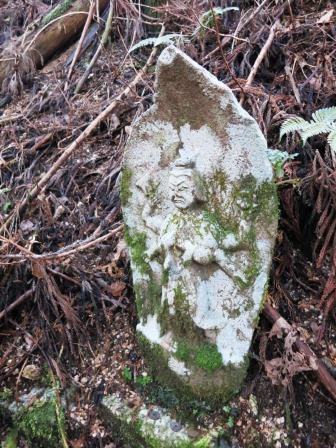急な下り坂が始まる。左へ大きくカーブする手前に説明板が 立ち、その奥に小さな観音像がある。石の多い急な急な坂道を重い荷物を運ぶために黒牛が使われ、その供養塔である。街道沿いでは通常は馬頭観音が祀られているが、牛頭観音が祀られているのを見たのは初めてである。 関東の鎌倉古道、旧東海道でもなかったので、特別にアップで撮影した。かわいいものであった。 |