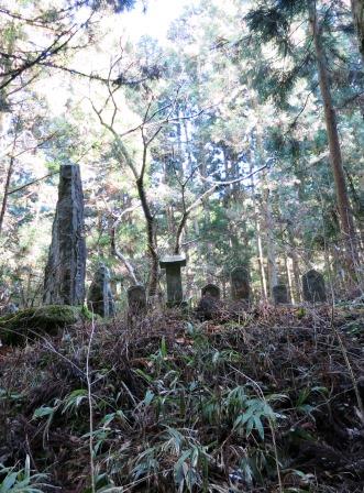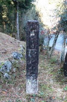 熊野神社の前を過ぎると、杉木立の中の急な坂道をのぼり、県道に合流する。すぐに、標高801mの馬籠峠に到着する。平成17年(2005)の越境合併で、木曽郡山口村が中津川市と合併したことで、ここが県境となった。 ![]() 急な下り坂となる。最初は石畳があり、その先は檜の木立の中を進むが、右の斜面の奥に石仏、石塔がならんでいる。いかにも木曽の山奥という雰囲気である。 まもなく少し開けた場所となる。 一石栃(いちこくとち)の立場跡である。 ![]() |