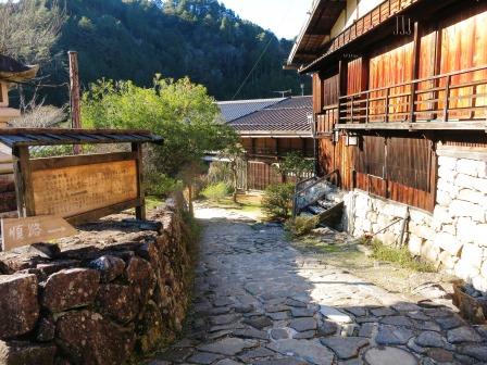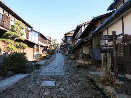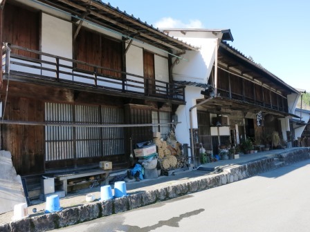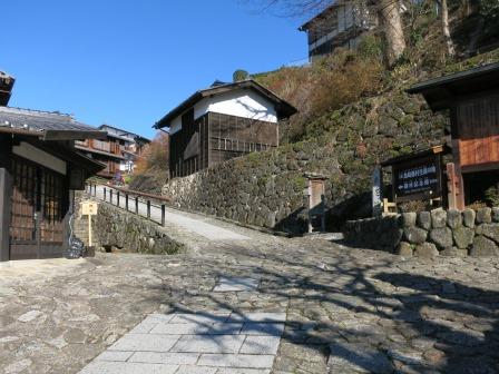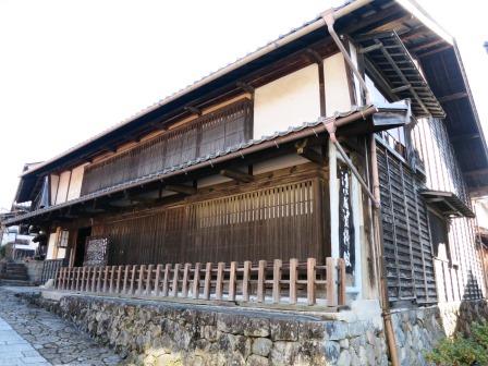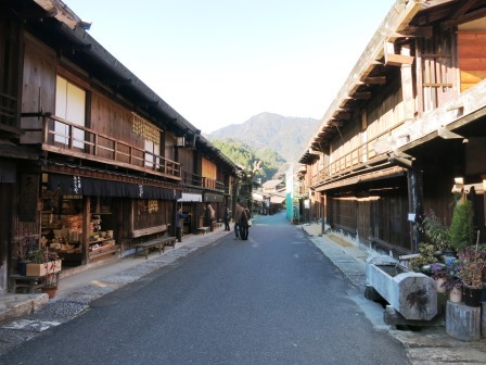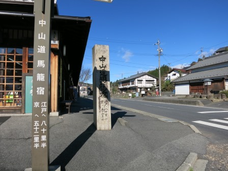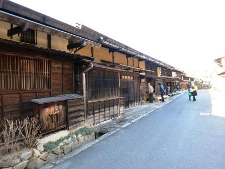 すぐ先から宿の町並みが始まる。 天保14年(1843)には、本陣 1、脇本陣 1、旅籠 31軒、総家数83軒であり、町並みは約700mで、木曽路11宿の内で最も小さな宿場であった。 過疎化が進んでいた中で、観光開発としての集落保存事業が昭和43年(1968)から本格化し、昭和51年(1976)「重要伝統的建造物群保存地区」に選定された。中山道では他に は奈良井宿だけである。 <あぶらや> <いこまや> ![]() ![]() 江戸時代の雰囲気を伝えている町並みがずっと続いている。 |