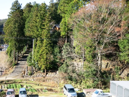 しばらく緩やかな道を下る。 右側には、松本城主小笠原貞慶の重臣倉科七郎左衛門が大坂からの帰りに土豪の 襲撃に会い討死し、その霊を祀ったという、倉科祖霊社がある。民家をすぎたあと、林の中を進む石畳となり、その先で視界が急に開ける場所がある。 ![]() 手前に県道、その先には大妻籠の集落が見える。 |