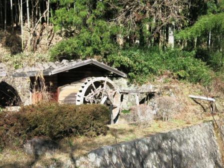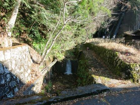 すぐに突当りで左折し、右折する枡形となる。明治38年(1905)の道路改修により焼失したが、昭和60年代になって復元された。改修された道は緩やかに右にカーブして上っているが、復元された桝形は、突き当りの水車小屋から石段となって上る。 |