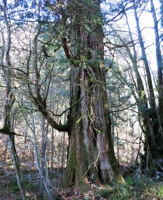 すぐ下に白木番所跡がある。当初の下り谷(この南)にあったものが、寛延2年(1749)に移転してきたという。 西の奥に、子安観音が祀られている堂を覆っている建物がある。 杉や桧の林の中を下っていくと、さわらの大樹がある。「樹齢約300年、胴回り5.5m、樹高41mという。このさわらの下枝が立ちあがって特異な枝ぶりとなっており、このような形の枝ぶりを持った針葉樹を神居木(かもいぎ)という。」と説明板にあり。 、木橋や石畳の道を進んで行くが、このあたりは中山道の形状がよく残っている所で、国史跡に指定されている。 |