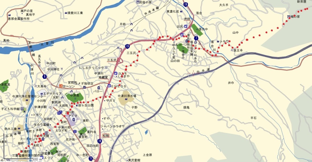 行く手に見える木曽の山々の眺めは格別である。 中央に見える赤味がかった橋は、中央自動車道の落合川に架かる陸橋。 橋の手前に、落合宿の家並みがはるかに見える。 中山道は、橋の左、手前の山の中腹に沿ってすすむ。 |