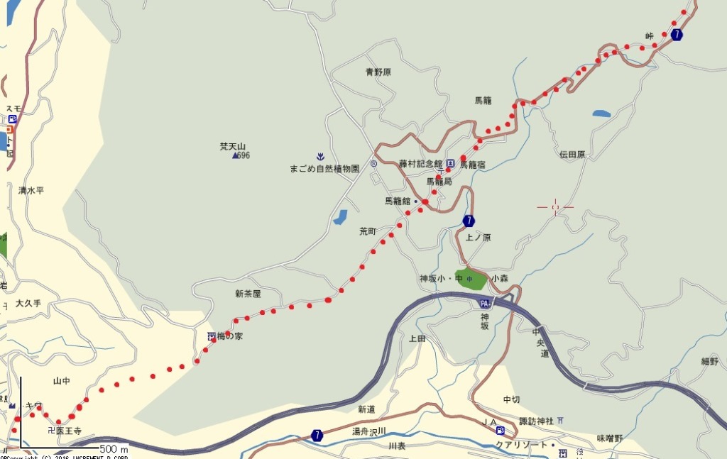 中津川-南木曽 地図→①中津川-新茶屋 ②新茶屋-馬籠峠 ③馬籠峠-大妻籠 ④大妻籠-妻籠 ⑤妻籠-南木曽 |