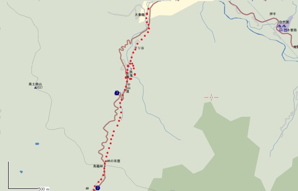 右に曲がらす 県道を少し進むと右手に広場があり、説明板と、滝におりる階段 がある。 <女滝>手前の川の右手が女滝、、向こう側の川にある左手の滝が男滝である。 街道が開かれて以来、旅人に名所として親しまれ、憩の場であったという。 吉川英治の宮本武蔵の舞台にもなっている。 男滝をみてから、右手の山に上って行く。 ![]() 右からの道との合流点に、地図の掲示板があり、山側には文字の庚申塔が立っている |