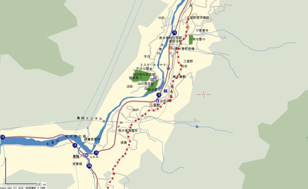 山の中の道をどんどん下っていくと、木曽川と南木曽の町が一望で斬る場所となる。木曽川に架かる赤い橋のすぐ上に、吊り橋が見える。(右写真) 桃介橋と言い、木曽川の読書発電所の建設に際し、福沢桃介(諭吉の養子)らによってつくられたものである。 (妻籠本陣の島崎家の戸長であった広助(藤村の兄)が桃介の発電所建設に抵抗した。) すぐ下にSL公園があり、D51が展示されている。 ![]() 中央線の旧線三留野駅跡である。 時間の関係で、ここから南木曽駅へ直行した。 |
