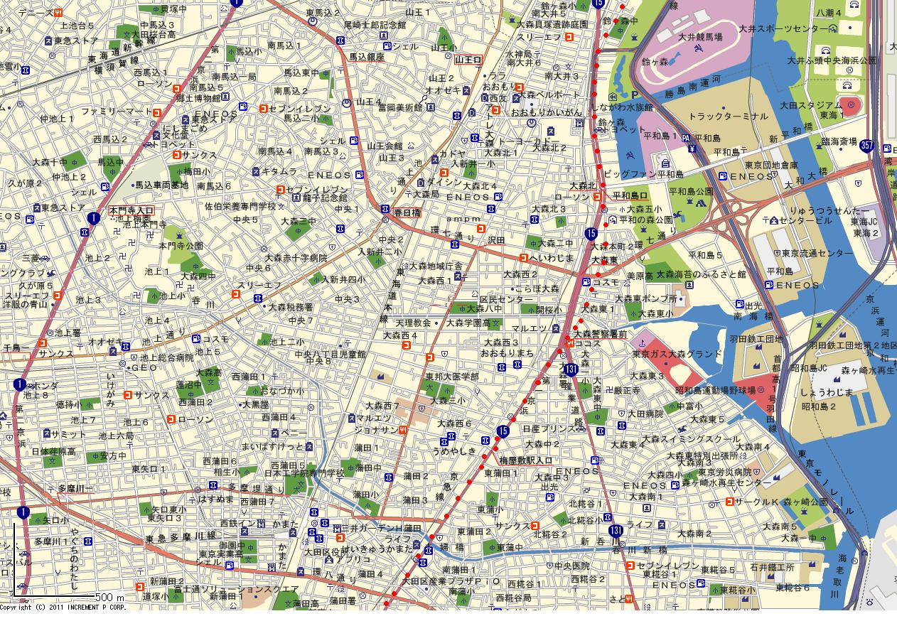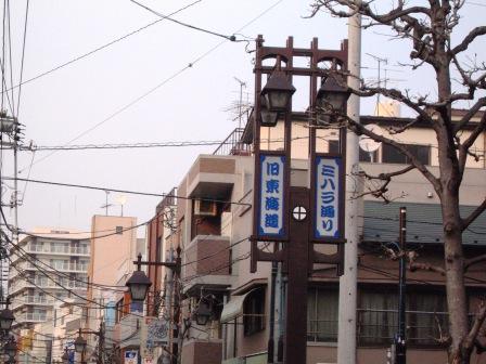 | 旧東海道は、平和島口の交差点から左に分岐する。ミハラ通りという名前でレンガ敷きで旧東海道の道幅が残されて、約1kmほど続き、ふたたび第一京浜と合流する。 |