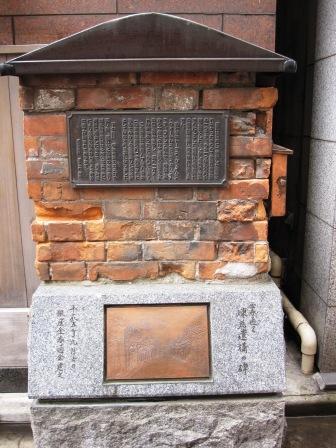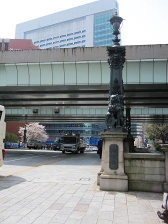 | しばらく進むと高速道路の下を通過する。家康の江戸 東側には京橋の名が彫られた明治8年(1875)の石橋の親柱が残されている。(西側には大正時代の親柱も残されている。) その先には、「煉瓦銀座之碑」とガス灯が建っている。それによると、「明治5年(1872)の火事により銀座は全焼し築地方面にまで延焼した。政府は国費により煉瓦造り2階建てアーケード式洋風建築を完成させた。煉瓦通りと通称された。」という。 |