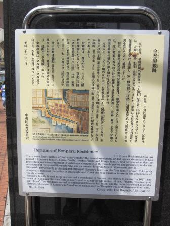 能楽は、室町時代以後幕府の保護を受けて興隆し、金春・観世・室生・金剛の四座が江戸幕府直属の能役者として知行/配当米・扶持を与えられていた。四座とも銀座・京橋に屋敷があり、金春座はここ銀座八丁目の『山王町』にありその後麹町に移ったという。 その横には、「イギリス人トーマス・ウォートルスにより設計された銀座煉瓦街の遺構が発見された」という説明板がある。 |
