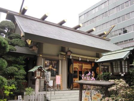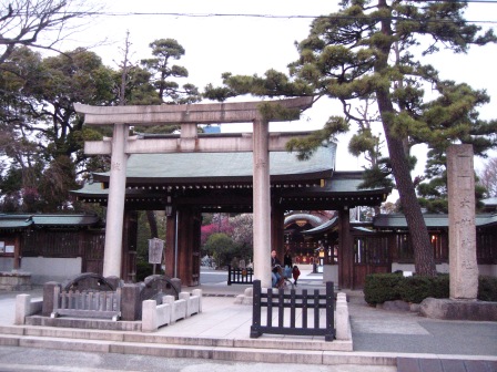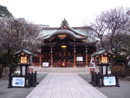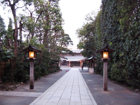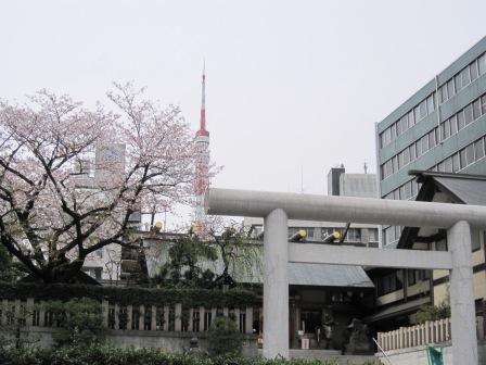 | 交差点から先は第一京浜国道となり、広い道路が続き、約1km強をひた 大門の信号のひとつ手前の角を右に入ると突当り正面に芝大神宮がある。 東京タワーが社殿の奥に見える。 |