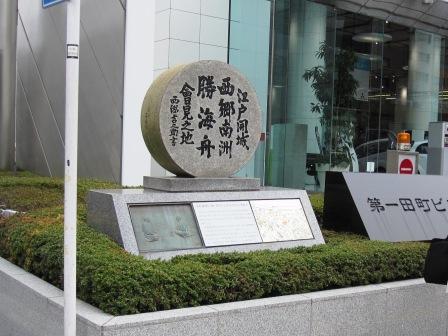 | 元の第一京浜に戻り、交差点を過ぎてすぐ左の三菱自動車の角に、丸い石碑と付近の地図と説明がある。 薩摩藩の蔵屋敷(すぐ裏が、海に面した砂浜で、薩摩から送られる米などが荷揚げされていた)があった所で、、慶応4年(1868)幕臣山岡鉄舟の斡旋で、幕府の陸軍総裁勝海舟と新政府参謀の西郷隆盛の会談が行われ、江戸城を無血開城を取り決めた。 |