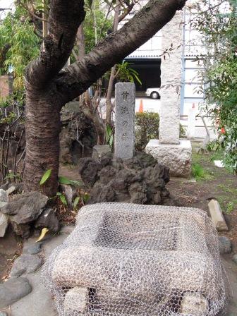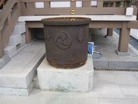 社殿前に嘉永5年(1852)の水鉢がある。 その先が公園となっているが、芝雑魚場の跡で、沿岸で捕れる小魚、貝類などを扱う問屋があったという。 |