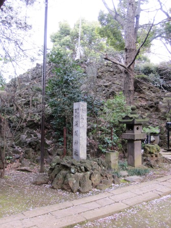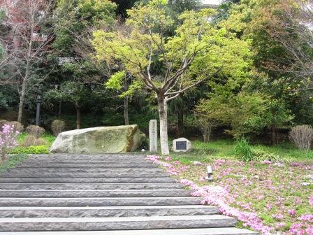 | すぐ先の桂坂への道の角に、石垣の石が展示されている。 高輪海岸に沿って造られた石垣に用いられたもので、主に相模湾岸から伊豆半島周辺で採石された安山岩という。 この広場には、高輪・芝車町・芝高輪北町を解説している説明板が立つ。 |