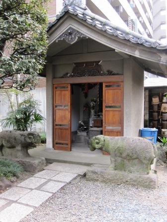 墓地に牛供養塔があり、門前に説明板がある。 江戸時代この辺りは車町といい、俗に牛町ともいい、江戸幕府が江戸城増築などの際の重量物の運 境内の地蔵堂の前には、石造の羊が1対ある。 |