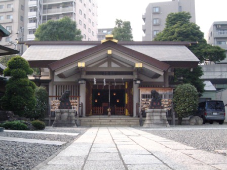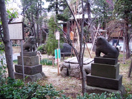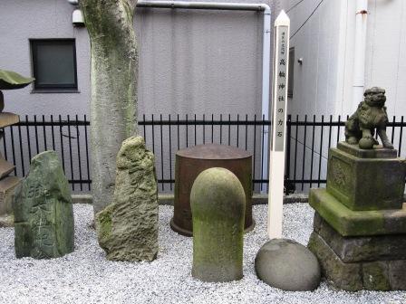 境内の狛犬の前に左右一個ずつの力石がある。ひとつは「奉納」『五拾八貫目」「芝伊皿子町 仁右衛門」・・・が刻まれた、長径80cm、短径46cm、厚さ28cmの安山岩という。 |