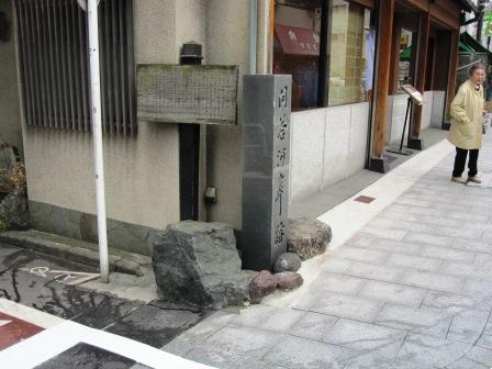 | 都営地下鉄泉岳寺駅手前の信号で、東海道線よりの歩道に渡ってから進むと、歩道を遮るように石垣がある。 説明板:高輪大木戸で享保9年(1724)に芝口門から移された。江戸の南の入口として道幅6間(約10m)の旧東海道の両側に石垣を築き夜は通行止めとして治安の維持と交通規制の機能を持っていた。天保2年(1831)には札の辻から高札場も移された。この高札場は、日本橋南詰・常磐橋外・浅草橋内・筋違橋内・半蔵門外とともに江戸の六大高札場の一つであった。 |