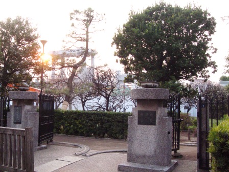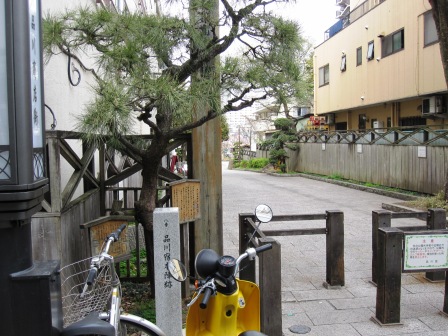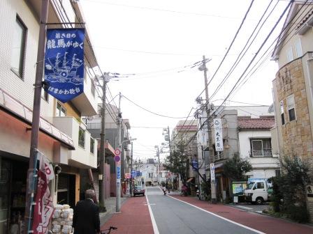 | 海雲寺の西側は京浜急行の青物横丁駅で、旧街道に戻り真っ直ぐ南下していくと約500m弱で鮫洲駅入口となる。商店街が途切れた先左側に 「花街道入口」という石柱があり左折して立ち寄った。勝島運河がある。 立会川駅に近くなると商店街では「若き日の龍馬がゆく 浜川砲台」」と書かれたバナーを掲げている。 |