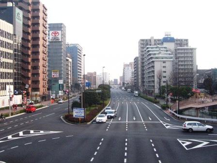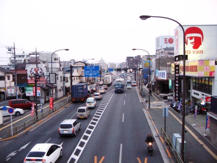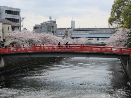 | 山手通りを過ぎると、まもなく目黒川に架かる品川橋となる。 江戸時代には境橋とも呼ばれ、旧東海道の北品川宿と南品川宿の境となっていた。 もとの目黒川の位置は今より北側を流れており(荏原神社の北)、橋から川の右側に見える荏原神社は、南品川宿の鎮守であるが、今の住所は北品川になっている。 |