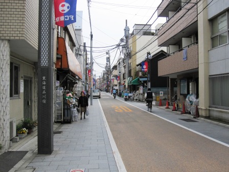 | 踏切を渡るとすぐに旧東海道らしい道幅で町並みが続く。今までの景色が突然変わる。第一京浜は京浜急行の西を走り、海岸沿いには別の自動車道が走っているため,