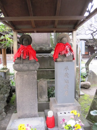 本堂前には、二体の地蔵が立ち、右側が平蔵地蔵で由来を記した石碑がある。 それによると 「江戸の末1860年頃、鈴ヶ森刑場の番人をしている乞食の平蔵が、ある日、多額の金を拾ったが、落とし主に返しお礼も断った。 他の二人の乞食が恨み、平蔵を小屋から追い出し凍死させてしまった。落とし主の侍はその場所に地蔵を建て供養した。その後、そこに電車が開通することになり、海雲寺の住職が引き取り境内に移し回向した」という。 |