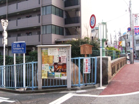 | 立会川に架かる橋が浜川橋で、ここから立会川の河口にかけて(今は勝島運河となっている)土佐藩の鮫洲抱屋敷があった。 この屋敷内には浜川砲台が築かれ、ペリーの2度目の来航の際には19才の龍馬も砲台要員として配置されていたという。 その脇にはには「坂本龍馬としながわ歴史マップ」という大きな掲示版が掲げられている。 |