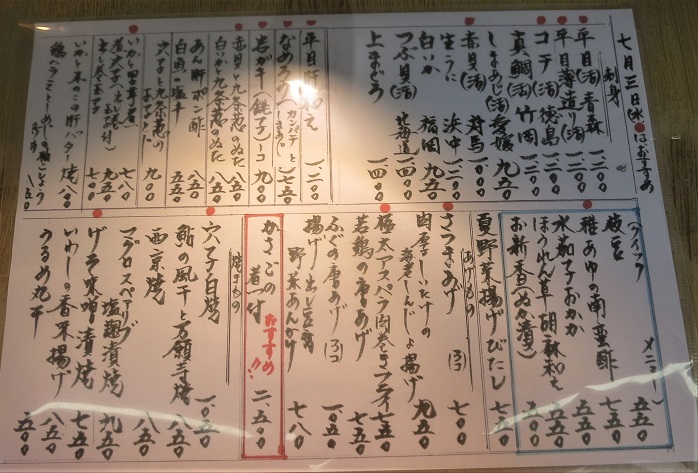 甘酒横丁の一角にある。 二階への階段入口の店構えは、横丁の居酒屋とは思えないほど、上品に よくできている。 カウンターとテーブル席で、それほど広くはなく、我々が酒・肴を楽しんでいる間 常時満席であった。 最初の「お通し」 がとてもよく、あとは推して知るべし、である。 通常のメニューのほかに、その日の「新鮮な肴のメニュー」 がびっしりとある。 |