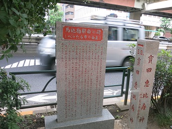 すぐ西側を通る首都高速の高架下にある道路わきに、「馬込勘解由の碑(べったら市の由来)」の石碑が建っている。 宝田神社の恵比寿講の前夜に市が開かれるようになり、神棚などと共に江戸名物の浅漬け大根が売られた由来がかかれている。 |