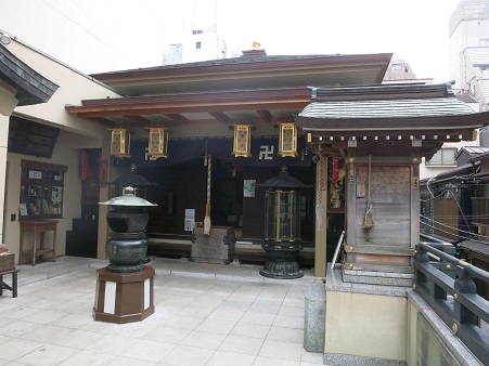 人形町交差点野の先100mほど右の路地の奥の石段の先に 大観音寺がある。創建は明治13年(1880)と比較的新しいが、そのいきさつが興味深い。 本尊は、鋳鉄製観音菩薩像の仏頭である。 (クリック) 北条政子が、鎌倉の扇ヶ谷に創建した新清水寺の本尊として安置された観音像であるが、火災で頭部が落ち、井戸の中に安置されていた。そのご、八幡宮の前の鉄井(くろがねい)から掘り出され、人形町の住人により、この地に運ばれ、この地に堂をたて、安置された。という。 |