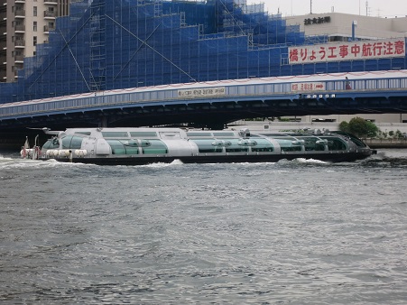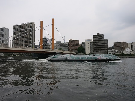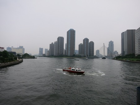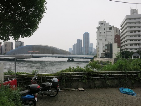 まもなく箱崎JCTで、TCATである。成田に向かう時によく使ったが、YCATが横浜駅の近くに開設してからは 全く来たことがなく、懐かしくロビーまでで行ったが、昔に比べて活気がなくなっていた。 ここから隅田川西岸まで、ビルの間を抜けて向かう。 <隅田川に架かる首都高速 隅田川大橋> ![]() |