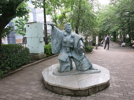 緑道には、大きな弁慶像がある。 説明板によると、 「当時この街では、江戸三座といわれていた芝居小屋のうちの市村座と中村座の二座が歌舞伎を上演しており、芝居街と呼ばれていた。また浄瑠璃による操り人形の芝居小屋も数件あり、庶民の人気を集めていた。ここで使われた人形の製作と修理に当たった人形師たちはこの周辺に住み、人形細工と販売を業としていた。・・人形町のいわれである。」 |