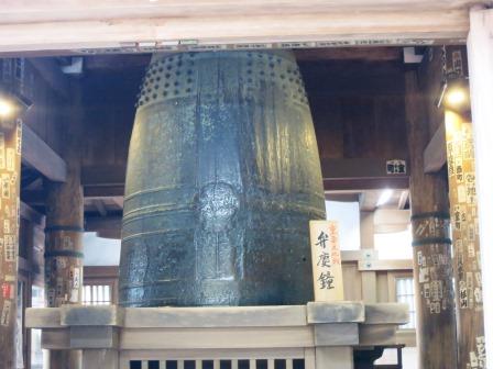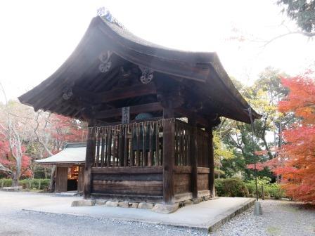 近江八景の「三井の晩鐘」のある鐘楼で、慶長7年(1602)に再建された。宇治の平等院、高尾の神護寺と共に、日本三名鐘に数えられる。 一般の鐘楼と違い、周囲には下に腰板を廻らし、上は連子をはめている。 金堂のある境内を少し上がった所に、弁慶の引き摺り鐘を収めた堂がある。寺の初代の梵鐘で、奈良時代の作とされる。 田原藤太秀郷の三上山のムカデ退治伝説や弁慶の伝説など言い伝えが多くある。 |