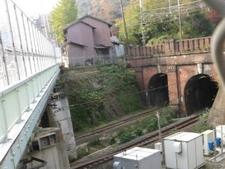 右側に風呂屋があるなど古くからある町並みで、少し先でJRの線路をわたる。下を走るJR線は右奥で京阪線の下をくぐっていくが、その橋は大正時代にレンガできたものという。 |