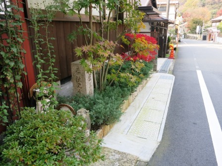 すぐ先で大乗寺の入り口があり 酔芙蓉の寺という。夏の季節ではないので先に進んだが、地蔵の祠もある昔ながらの道である。車が通ると、横になって避けなければならないほど狭い道で、旧東海道のなかでは、山道を除けば他にないほどであった。 すぐに下りとなりバス道路の三条通りに合流する。 |
