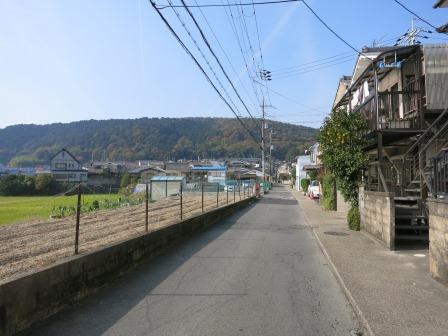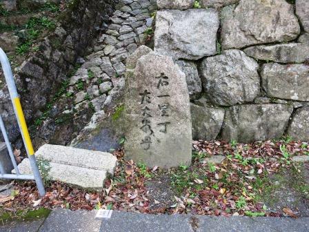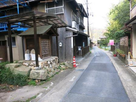 三条通りから離れ、住宅街の中を日ノ岡峠方面へ進む。左側にはまだ田畑が残り、道は上り坂となるがその先は急に狭くなる。案内書にあった「亀の水不動尊」を探したが見つからないまま通り過ぎてしまった。 |