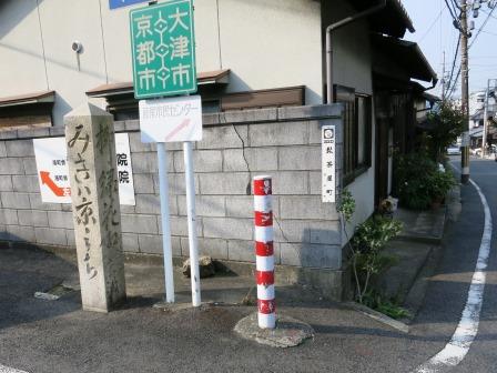 左側の民家の前の植え込みに「左 伏見奈良海道」「右 京三條みち」とある石柱があり、その先には「元祖走井餅本家」の石柱がある。両方とも新しい石柱である。 間もなく旧東海道は大谷駅を過ぎて先で、京阪京津線で途切れ、歩道橋を渡って国道1号の左歩道を進む。 |