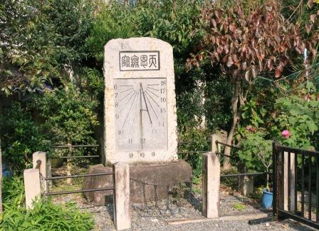 西にまっすぐ進んで今の三条通に合流しJR線をくぐり、200m程進んで細い道を西に進む。 時間があるので、その前に右手の森に長い参道が続く天智天皇陵を訪れた。 300m程続いた先の広場には玉砂利がしかれ、奥に白塗りの鳥居がある。参道から出た脇に時計のモニュメントがある。タテ型の日時計である。 京都時計商組合が、天皇が日本で初めて漏刻(水時計)をつくり時刻制度を定めたことにちなんで建立したという。 |