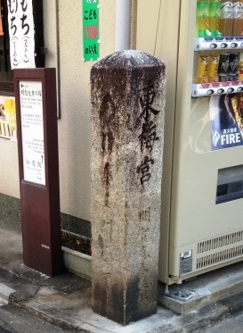 しばらく行くと民家前に新しい石柱が立ち、「大津算盤の始祖・片岡庄兵衛」の家という。 明国から長崎に渡来した算盤を参考にしてその製造を始めたという。(慶長17年(1612)) この先(西)で店を構え、幕府御用達の算盤師になったという。 石柱のある所には、車石が置かれている。 |