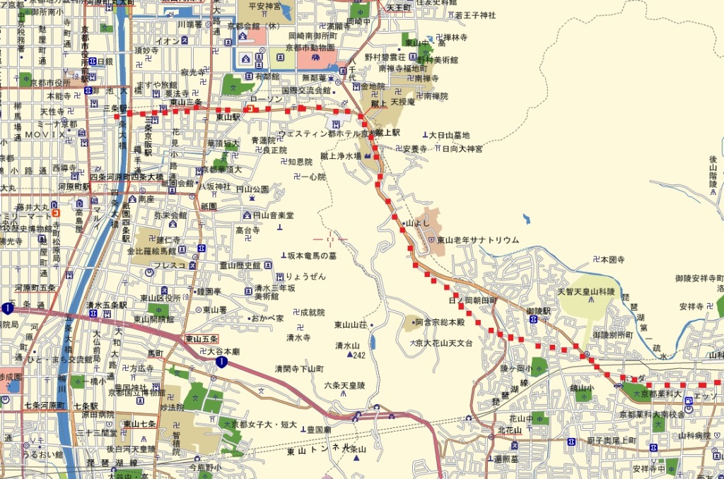 大津-京都 地図→①大津-山科 ②山科-三条大橋 |