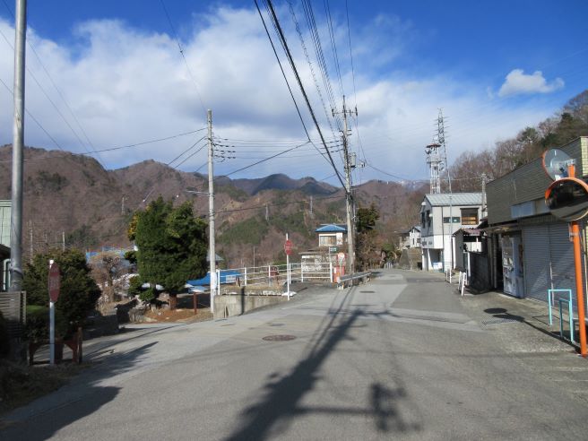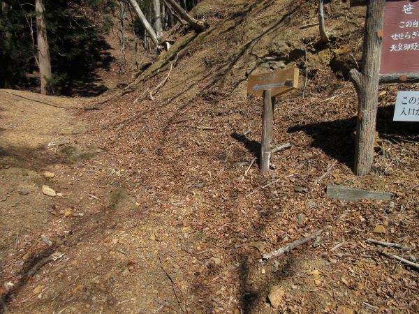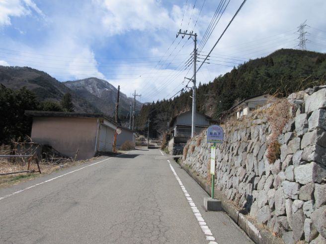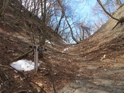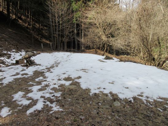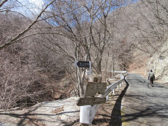 甲斐大和川の出口に降りると、一面の雪である。 少し先の県道の左側にガードレールの切れ目があり、旧甲州街道への入口らしい。 その先に白い標柱が見える。 甘酒茶屋跡とある。 ![]() この先、小さな沢を下るようなので、旧道を下るのはあきらめて、県道を進むことにした。 |