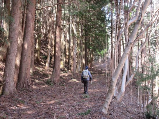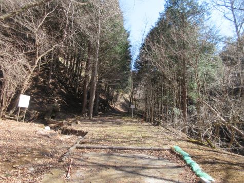 旧道は沢に沿って比較的まっすぐに下っていくが、車道は山の傾斜に沿って進むので、歩く距離が半端ではなかった。ただひたすら歩くのみ。 ようやく駒飼宿側の甲州街道峠道の入口に着いた。 <峠道入口から見た先の景色> ![]() 説明板によると 昭和62年にそれまで荒れていた清水橋から峠までの旧道が整備され、復元されたという。 |