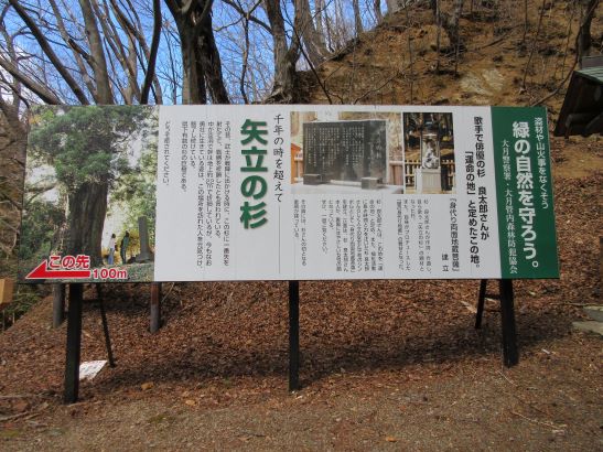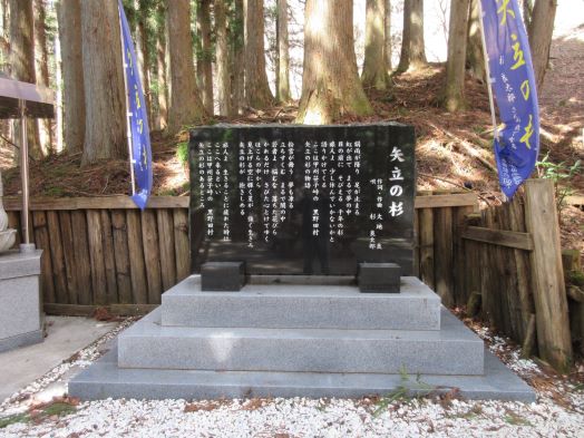 県道から左手に降りていくと大きな説明板が立つ。 戦国時代 武士が合戦に7でかけるときに、この杉に一番矢をい立てて、戦勝を祈願したと言われている。 <杉良太郎の歌碑> <見下ろしたところ> ![]() 近くに寄るとその存在感に圧倒される。 樹齢 約1000年 根廻 14.8m 樹高 約26.5m |