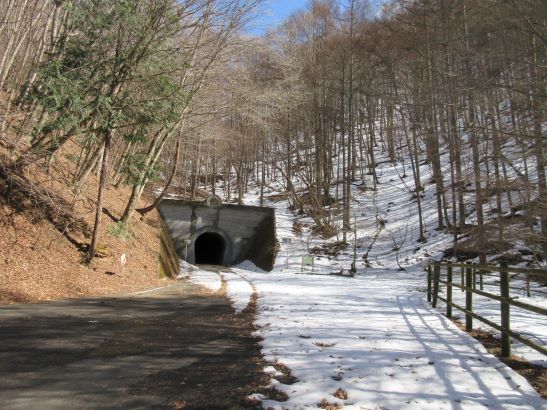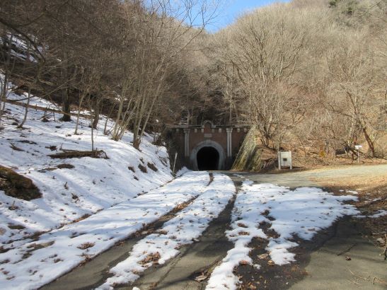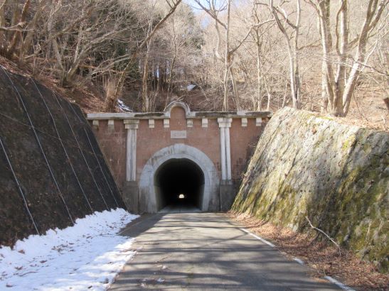 甲州街道の難所であった笹子峠を超えるために、昭和13年(1938)に完成した全長239mのトンネルである(幅3m) 坑門の柱上の装飾と赤レンガが良く調和している。 右側の案内板のところを登って、峠越えをする。 ![]() |