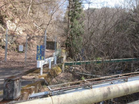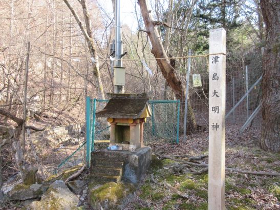 この先を更に下ったところから、旧道は笹子沢川を渡って、右側-対岸-を下っていたと思われるが、その道はわからず、県道をそのまま下った。 対岸には駒飼一里塚跡があるらしいが、わからない。 川を渡る手前右に津島大明神の社が祀られている。 天狗橋を渡ると、右側から道が合流しているが、これが本来の旧道と思われるが、柵が設けられていて、奥へ行くことができなかった。 |