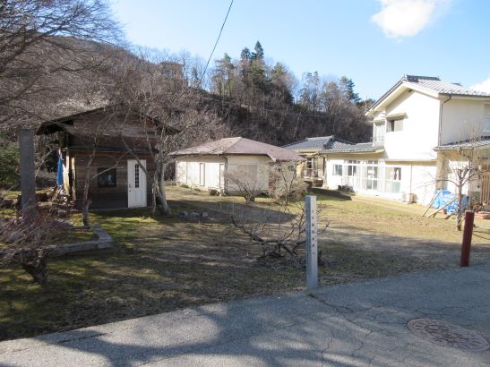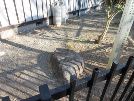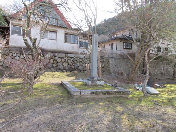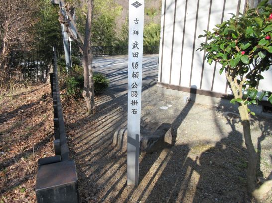 道路脇に小さな標識が立って方向がわかったが、なかなか探しあぐねた。 ようやく見つけたのは、少し高台に位置する民家の脇の道路側から見つけることがで た。それほど大きくない平たい石の脇に 白い標柱がたち、 『武田勝頼公一行が鶴瀬・ 駒飼郷に滞陣のおり、この石に腰掛け、敵や周囲の動静を伺っていたところ』 とある。 |