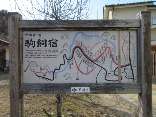 すぐに開けた大地が広がり、駒飼宿に入る。 ここには、甲斐の国の御料牧場があったといい、駒飼宿の名が名が付いたという。 北に位置する鶴瀬宿との相宿で、21日から末日までの間、人馬の継立てを担当していたしていた。 本陣 1, 脇本陣 1,旅籠 6軒 |