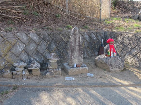 左手に火の見櫓があり、その道路側に変わった形の地蔵が立っている。 脇に「黒垈(ぬた)宿笠掛地蔵由来」という説明板がある。創建は安政2年(1855)で、13代徳川家定の天領政治時代という。 由来は定かではないが天保の大飢饉、七公三民の重税など領民を襲う窮乏を、この地蔵に心願したものという。 |